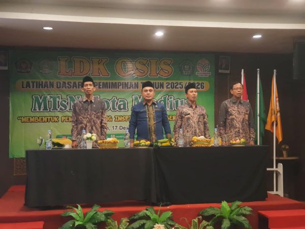 Kota Madiun – Kepala Kantor Kementerian Agama Kota Madiun membuka secara resmi kegiatan Latihan Dasar Kepemimpinan (LDK) OSIS MTsN Kota Madiun yang mengusung tema “Membentuk Pemimpin yang Inspiratif dan Berkarakter”. Kegiatan tersebut dilaksanakan di I-Club Madiun, Rabu (17/12).